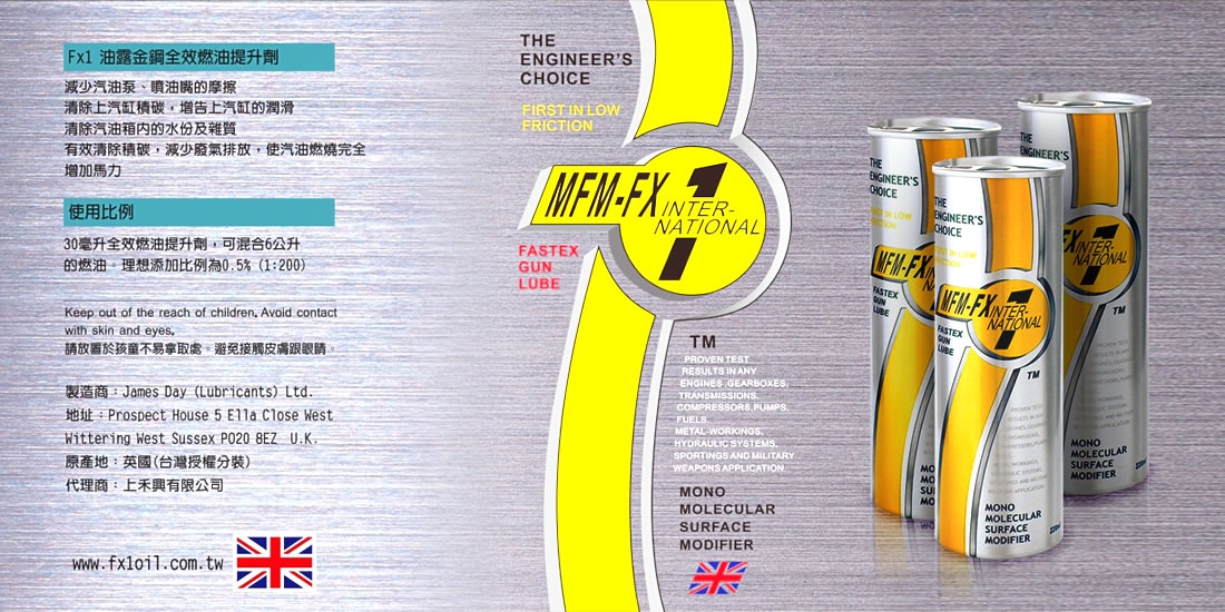 FX-1大英國協油精,超潤滑,省油又有力。 基於環保理念所研發出的國防科技產品,對機械設備無害的微分子潤滑油;能源的原動力,是碳氫化合物的單分子(液態)金屬表面改質劑。能滲入金屬細孔,消除一切粗糙(如積碳,油泥)在金屬表面形成0.05um的單分子超滑薄膜,能耐高溫、耐超高壓、抗磨蝕。 FX-1大英國協油精-絕對不同於市面上任何的添加劑,在50℃以上時與金屬表面結合,產生的單分子薄膜,可降低90%的表面磨擦。可和大部份的潤滑油、汽油、...